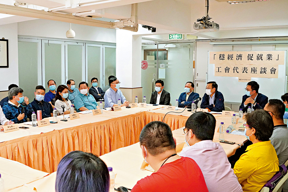 工聯會職訓委主任陳鄧源說,香港過去兩年經歷「黑暴」和疫情衝擊,航空、旅遊等行業最受影響,很多工友失業、停薪留職、被迫放無薪假。特區政府之前表示要創造6萬個臨時職位,但現時只有4萬個,仍有2萬多個缺口。海員工會梁耀全反映,港澳船員工由2019年初的1200人減至目前僅有300人,即使留職亦要減薪30%或長期放無薪假。日語導遊唐寧指出,旅遊業全面癱瘓將近兩年,大部分從業員已經轉行,希望政府增設郊野公園、傳統文化宣講員等臨時職位。酒店房務員麥淑琼提到,隨着疫情平緩,酒店行業已逐漸恢復,從業員工作量大增,但收入沒有得到相應提升。服務業工人譚慧華激動地說,自由工作者的欠薪和歧視問題時有發生,建議政府保障最低強積金供款額,要求僱傭雙方簽訂合約。運輸業工人曾憲傑反映,超過2000名跨境司機每日往返兩地,但在香港沒有休息地方,有的只能在車上過夜,嚴重影響司機狀態。座談交流中,還有工會代表指現時失業人數18萬,但勞工處有6萬個職位空缺,存在「有工無人做、有人無工做」的錯配現象。有製造業工人更指已失業多時,平日只靠「炒散」當小販,每日賺取一二百元不夠養家。有搭棚工人亦抱怨保險費用過高「買不起」,人身安全得不到保障。