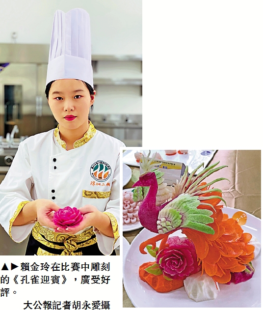 【大公報訊】記者胡永愛深圳報道:深圳市第二職業技術學校(以下簡稱「深二職」)的高三學生賴金玲,就讀於中餐烹飪與營養膳食專業,因為神奇的刀工,被人戲稱「神雕俠女」,並走紅網絡。不久前,她作為唯一的果蔬雕刻選手,代表學校參加了廣東省職業院校學生專業技能大賽烹飪賽項,並獲得團體二等獎。賴金玲說,「我從進校就愛上了雕刻,以後也希望能繼續深造!」