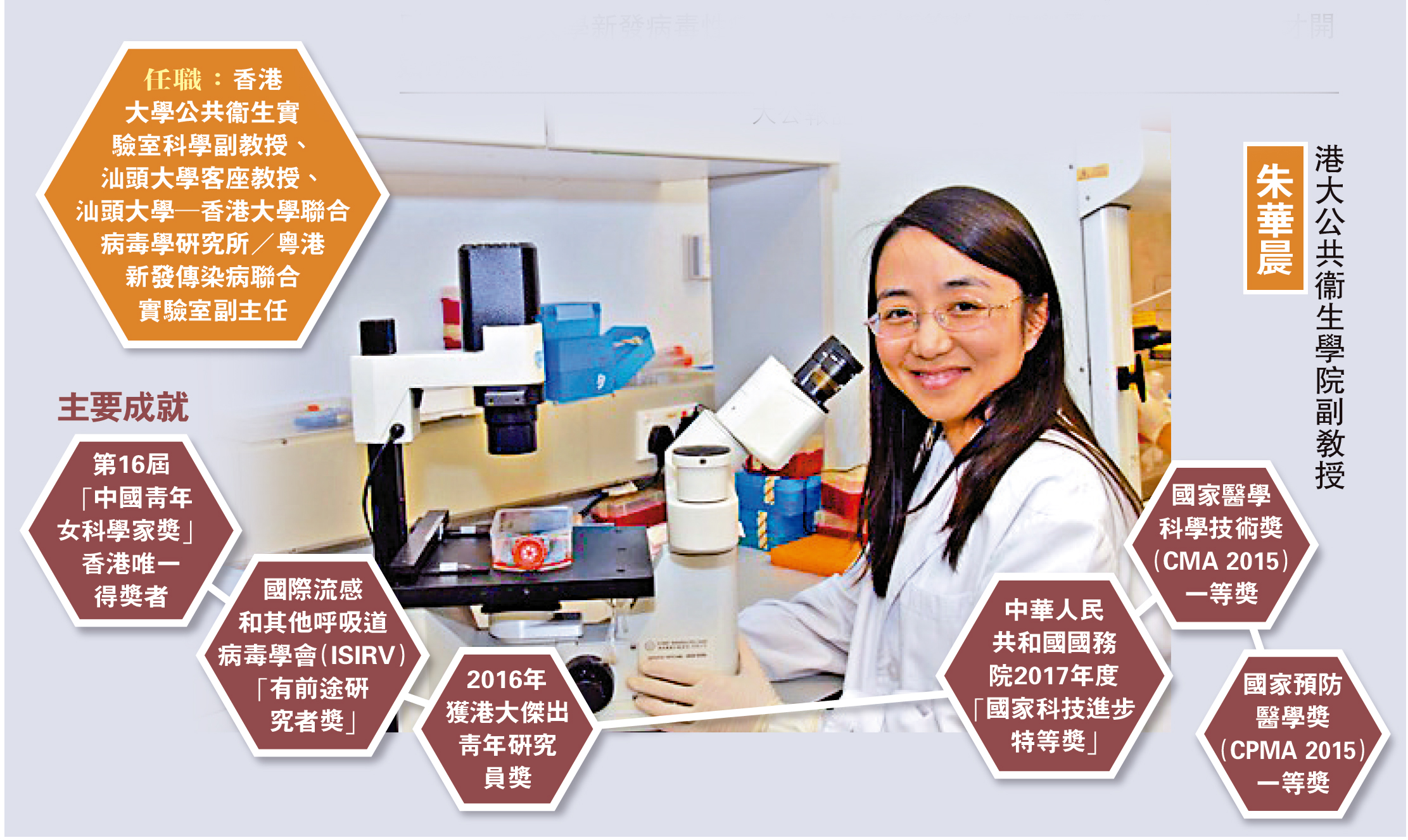 香港大學公共衞生學院副教授朱華晨獲得第十六屆「中國青年女科學家獎」,她是香港唯一獲獎者。朱華晨長期研究生物病毒與新發性傳染病,與H1N1、H7N9、MERS等惡性病毒性疾病打交道。這次新冠肺炎疫情爆發,朱華晨也站在了病毒研究的第一線。她接受《大公報》訪問時特別感謝香港大學新發病毒性疾病學講座教授管軼,坦言是受管軼的影響,才開始研究病毒。