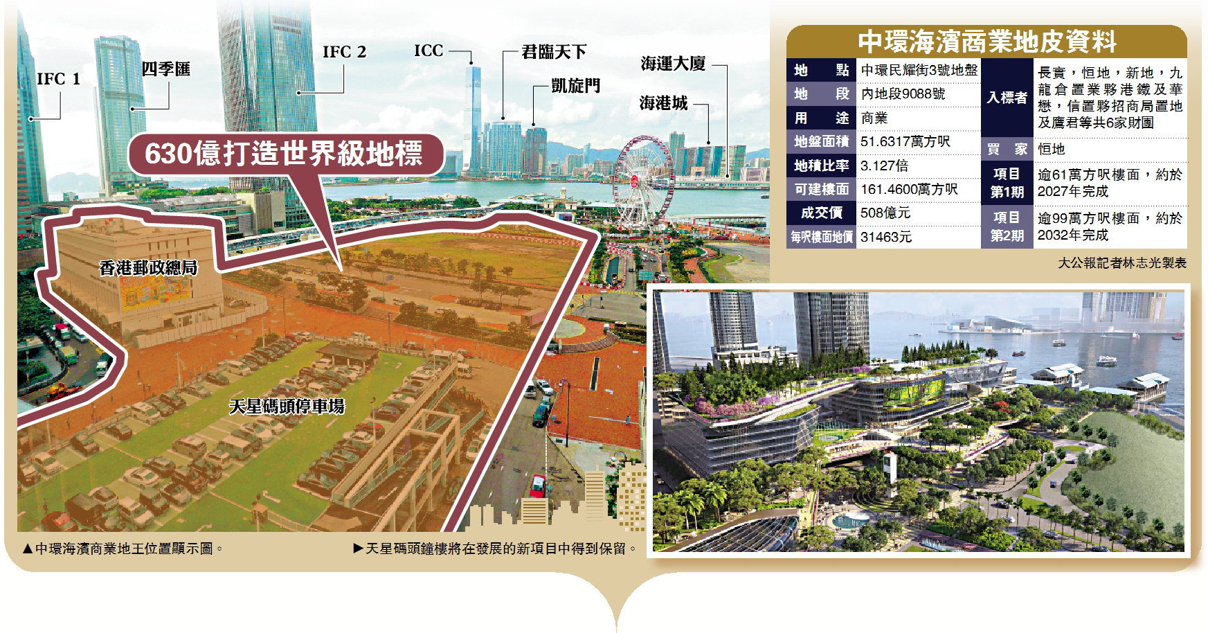 獨一無二的中環海濱商業地王,在經歷近1年的招標及評審後,終由恒地(00012)在完全符合「雙信封制」的要求,並取得滿分下,以本港史上最高地價508億元奪魁。恒地表示,集團預計總投資630億元,在中環商務中心區,打造一個傲視世界的香港新地標。\大公報記者 林志光
