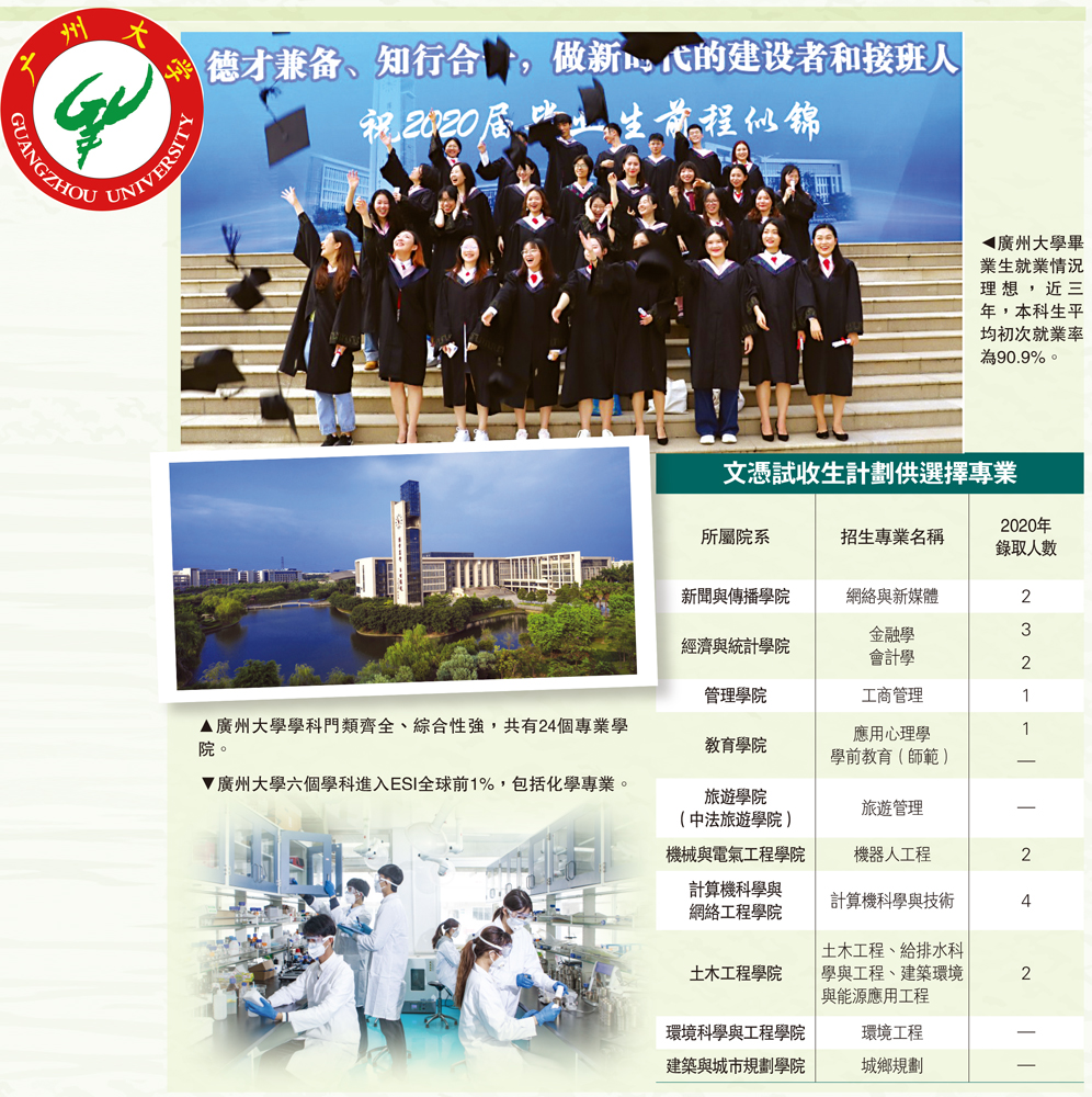 廣州大學是以國家一線城市「廣州」命名的綜合性大學,有90多年的辦學傳統,是廣東省高水平大學建設計劃重點建設高校、廣州市高水平大學建設高校。廣州大學學科門類齊全、綜合性強,共有24個專業學院,並設有大學城校區、桂花崗校區及黃埔研究院,「一校三園」。學校教學設備完善、住宿環境舒適,充分給予師生教學及生活空間。近三年,廣州大學本科生平均初次就業率為90.9%,僱用單位總體滿意度高達98.7%,95%以上畢業生扎根粵港澳大灣區。\大公報記者 葉心弦