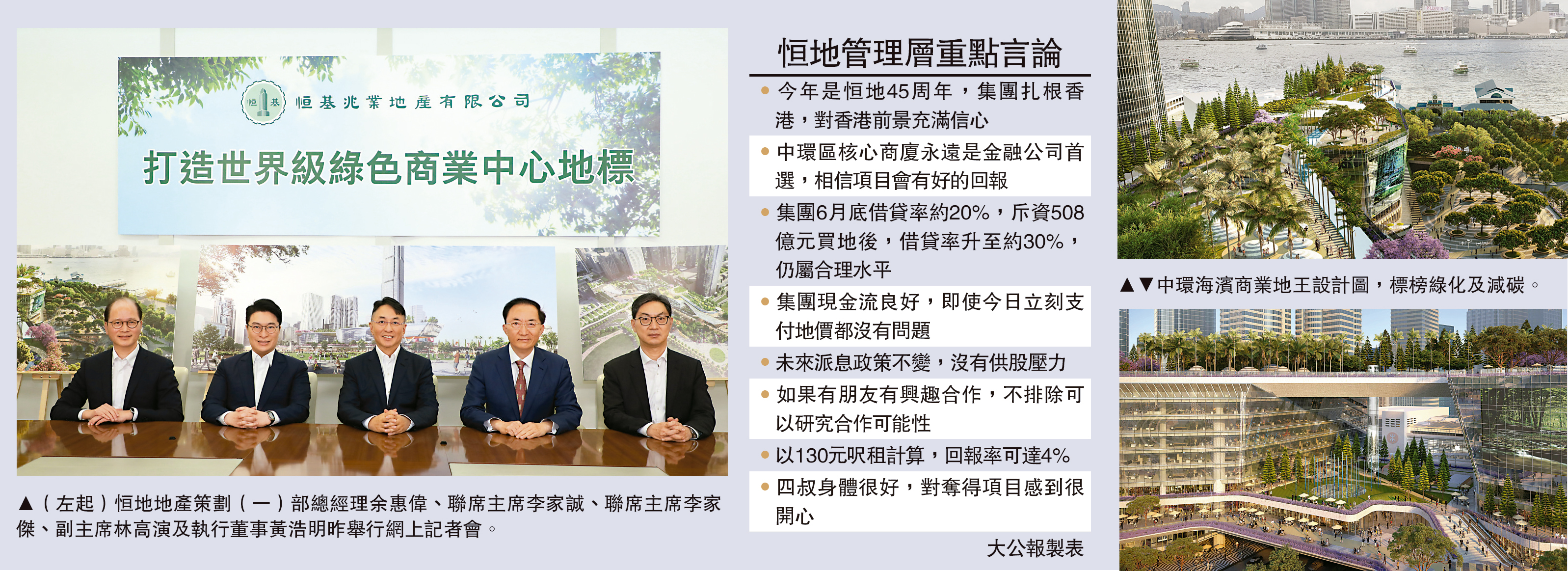 另一聯席主席李家誠則表示,今年是恒基成立45周年,集團扎根香港,對香港前景充滿信心,也相信香港作為國際金融中心,中環核心區商廈,永遠是跨國公司最搶手的選址,相信項目絕對會有好的回報。