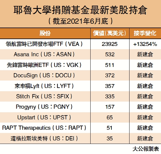 捐贈基金在今年8月中旬,上載截至6月底止持有美股情況,組合內合共有16隻證券,當中11隻是新加入的;另外,第二季清倉4隻股票。