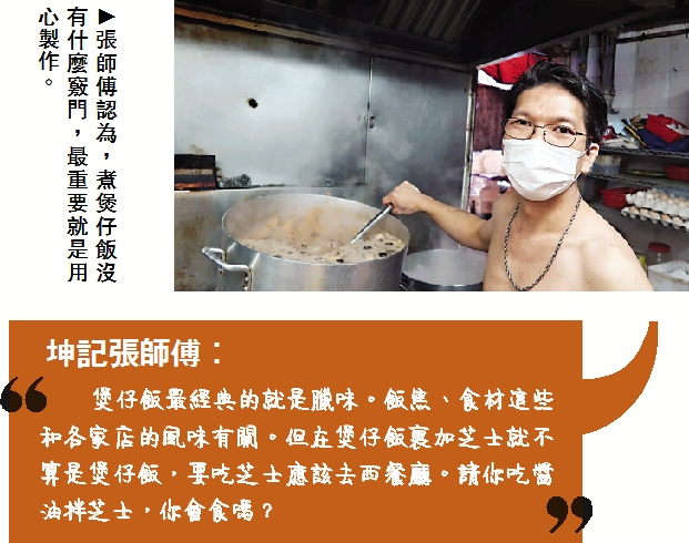 負責準備煲仔飯食材的張師傅說,做煲仔飯沒有什麼難度,最重要還是用心製作。在他看來,老闆坤哥便是用心之人,為保證味道如一,店裏只會選用當日的食材製作煲仔飯,而坤哥每天下午都會提前到店舖檢查食材。因品質有保證,有熟客一個月會來光顧十多次,仍不覺膩。每天單是用來做煲仔飯的臘味便有近十斤,其他食材總計有三、四十斤之多。疫情下,每晚仍能賣出超過200份煲仔飯。