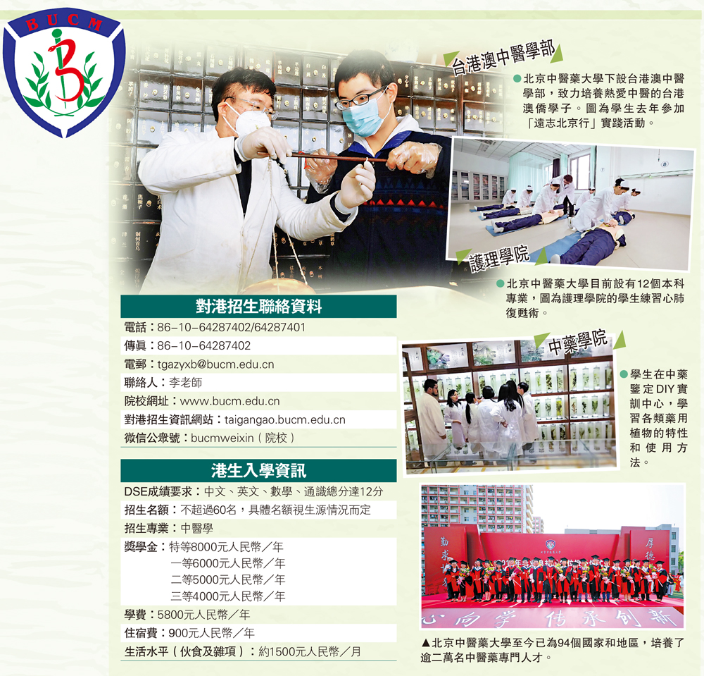 北京中醫藥大學(Beijing University of Chinese Medicine)創建於1956年,是內地最早成立的四所中醫藥高等學府之一。該校秉承「勤求博采、厚德濟生」校訓,倡導「人心向學、傳承創新」理念,堅持「立德樹人、以文化人」宗旨,弘揚「追求卓越、止於至善」精神,培養了不少品學兼優的醫學人才。建校伊始,學校已為94個國家和地區培養了逾二萬名中醫藥專門人才;亦設立台港澳中醫學部,專門對台港澳地區及海外華僑進行學歷教育及進修教育,致力培養熱愛中醫的台港澳僑學子。\大公報記者 鍾怡