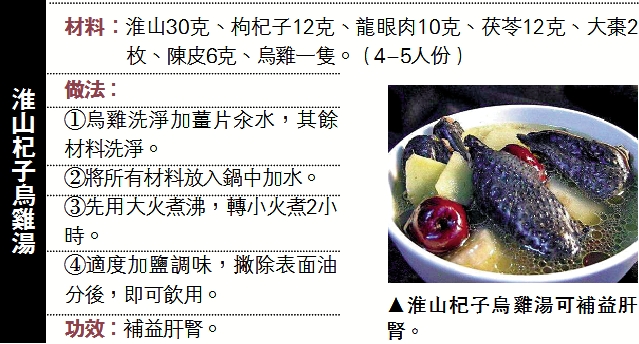 「黑色食物」有黑豆、黑木耳、黑芝麻等,它們可補腎氣。天冷時,進食溫熱食物可抵禦寒邪,如羊肉、桂圓、栗子、淮山等。養陰的藥材沙參、玉竹、百合、枸杞、羅漢果或加入白蘿蔔、冬瓜、絲瓜、海帶、海參等食材來煲湯或燉煮,可去火利尿、化油解膩、滋陰潤燥。冬季食材以滋陰為主,人們平時要多喝溫水,在養陰的同時還可以潤燥。