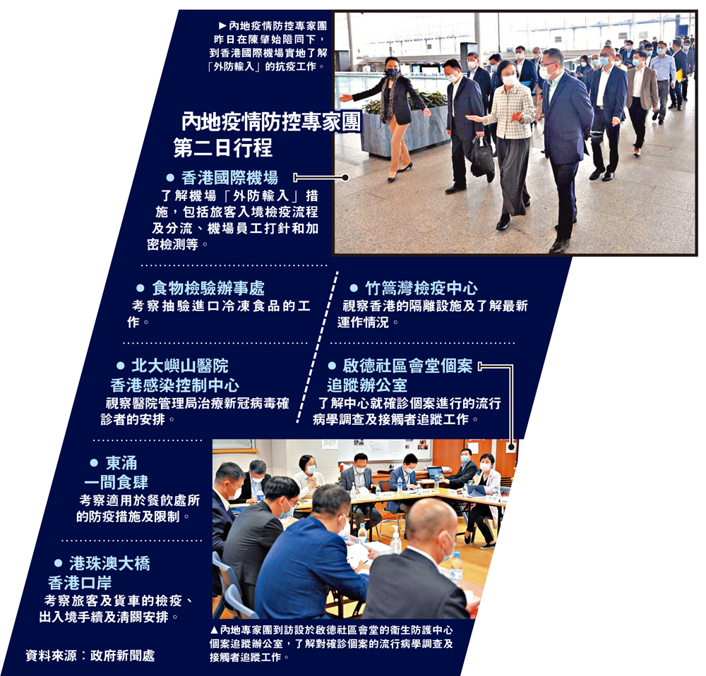 由港澳辦交流司副司長劉文達、國家疾控中心病毒學首席專家董小平等組成的內地疫情防控專家團,昨日早上九時到達香港國際機場,由食物及衞生局局長陳肇始、副局長徐德義、衞生防護中心傳染病處主任張竹君等人陪同,出席機場管理局安排的簡介會,並到禁區內考察,了解機場旅客入境檢疫流程及分流、機場員工接種疫苗及加密檢測情況等。