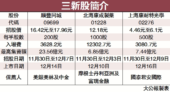 【大公報訊】順豐同城(09699)、北海康成製藥(01228)、上海康耐特光學(02276)三新股於今日招股,合共集資約38億元。當中,由順豐控股分拆的杭州順豐同城實業集資最多,達23.56億元。公司執行董事兼首席執行官孫海金表示,配送服務行業在未來5年將是非常值得期待的賽道,公司是唯一面向全社會、純正稀缺的技術物流公司。