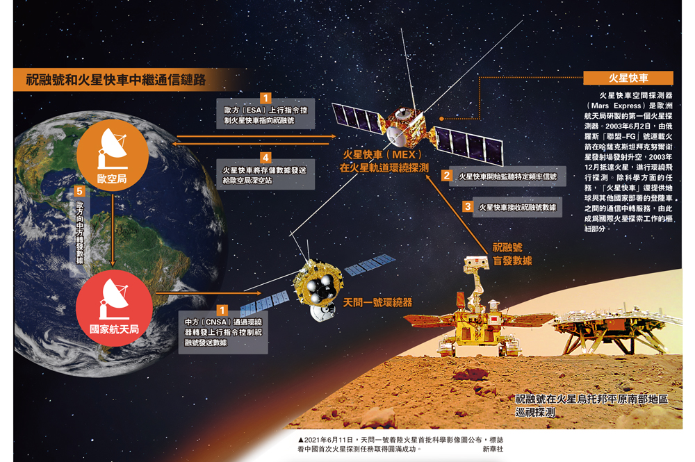 記者從國家航天局探月與航天工程中心獲悉,2021年11月,中國「天問一號」火星探測團隊與歐空局「火星快車」任務團隊合作,開展了「祝融號」火星車與「火星快車」軌道器在軌中繼通信試驗,通信距離約4000公里,通信時長10分鐘,經雙方任務團隊判讀數據結果,確認任務取得圓滿成功。後續,雙方將在本階段試驗的基礎上,進一步開展科學數據中繼通信合作。\大公報記者 劉凝哲北京報道