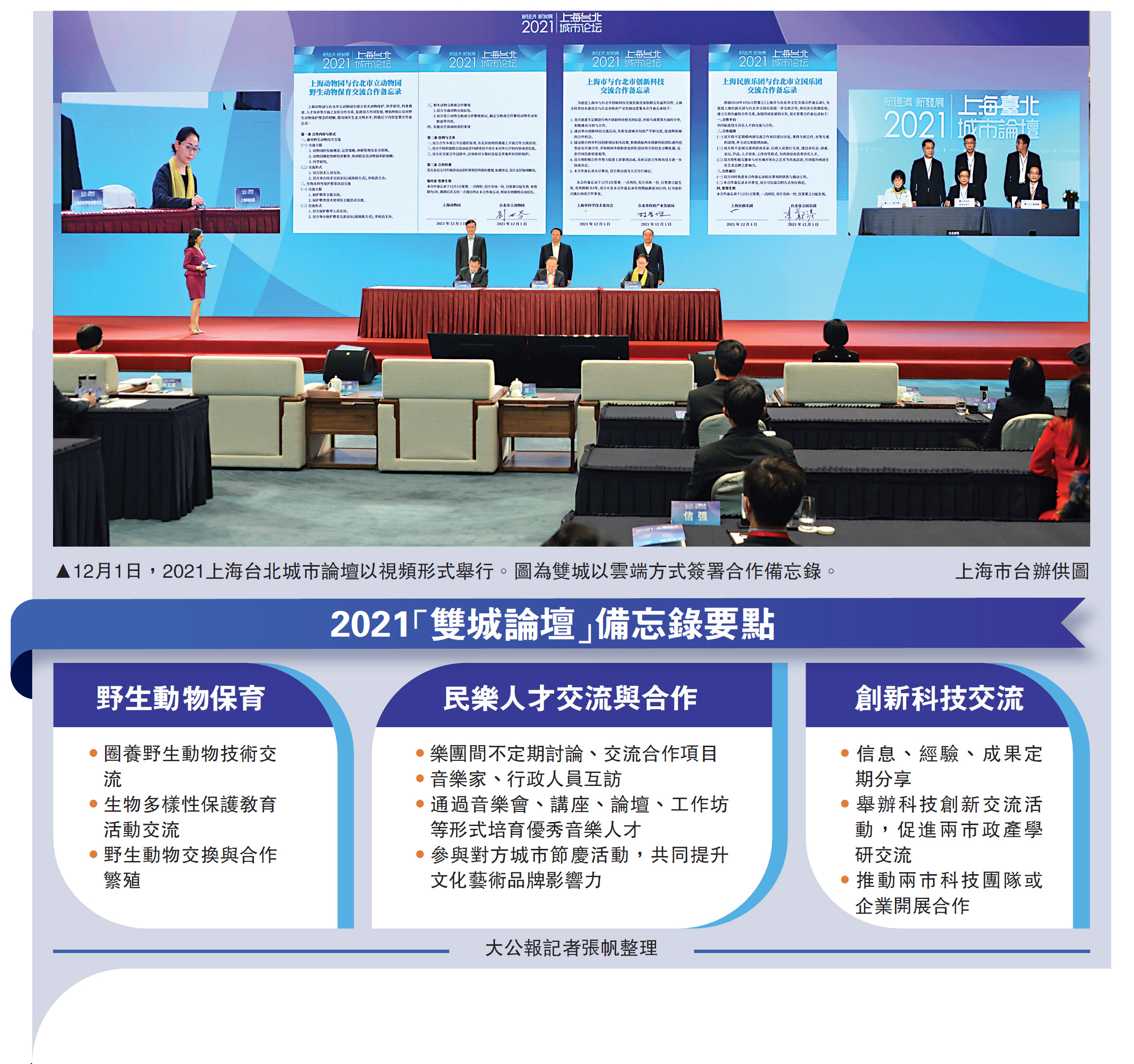 以「新經濟·新發展」為主題的2021上海台北城市論壇12月1日下午以視訊形式在上海和台北兩地同步舉行。上海市市長龔正、台北市市長柯文哲出席論壇並致辭。龔正表示,將一如既往關心支持台胞台企在滬發展,期待兩地攜手努力,共譜雙城合作新篇章,同創美好生活新未來。論壇期間,雙城還圍繞「疫情防控常態化下的城市數字化轉型」等主題進行了經驗分享和交流互動。\大公報記者 張帆上海報道