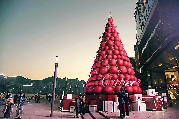 近期,一棵十三米高以紅色和金色點綴的巨型聖誕樹降臨K11 MUSEA前方,成為「打卡」地點。紅色的聖誕樹也讓傍晚收工路過尖沙咀海濱的市民感受到一絲溫暖。\香港中通社