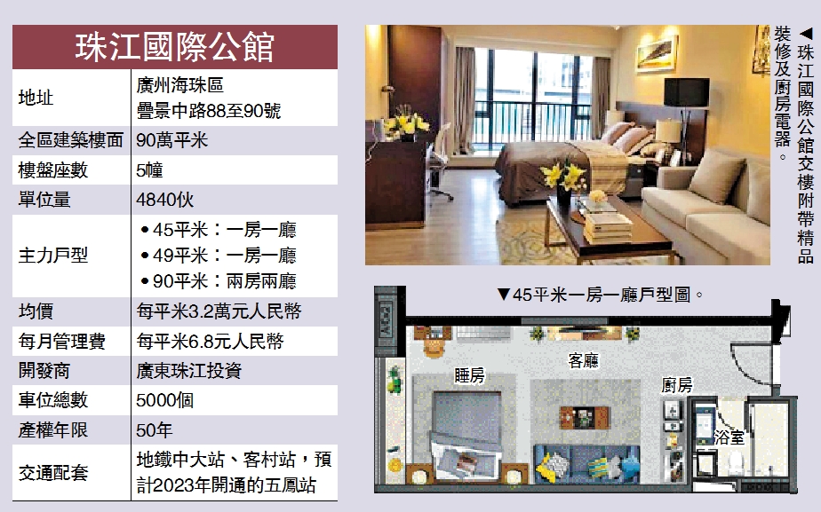 珠江國際公館鄰近廣州海珠區中山大學地鐵站,同時位處海珠區「一區一谷一灣」中的「中大國際創新谷」板塊。銷售人員表示,該公寓項目屬市區比較少有的現樓,產權50年,買家獲贈全屋家電,可以「即買即收租」。物業位處海珠區核心地段,樓價僅相當於周邊地價的50%,升值空間巨大。「買家可以低價搶佔海珠席位。」珠江國際公館屬公寓項目,香港買家也不受限購政策影響。