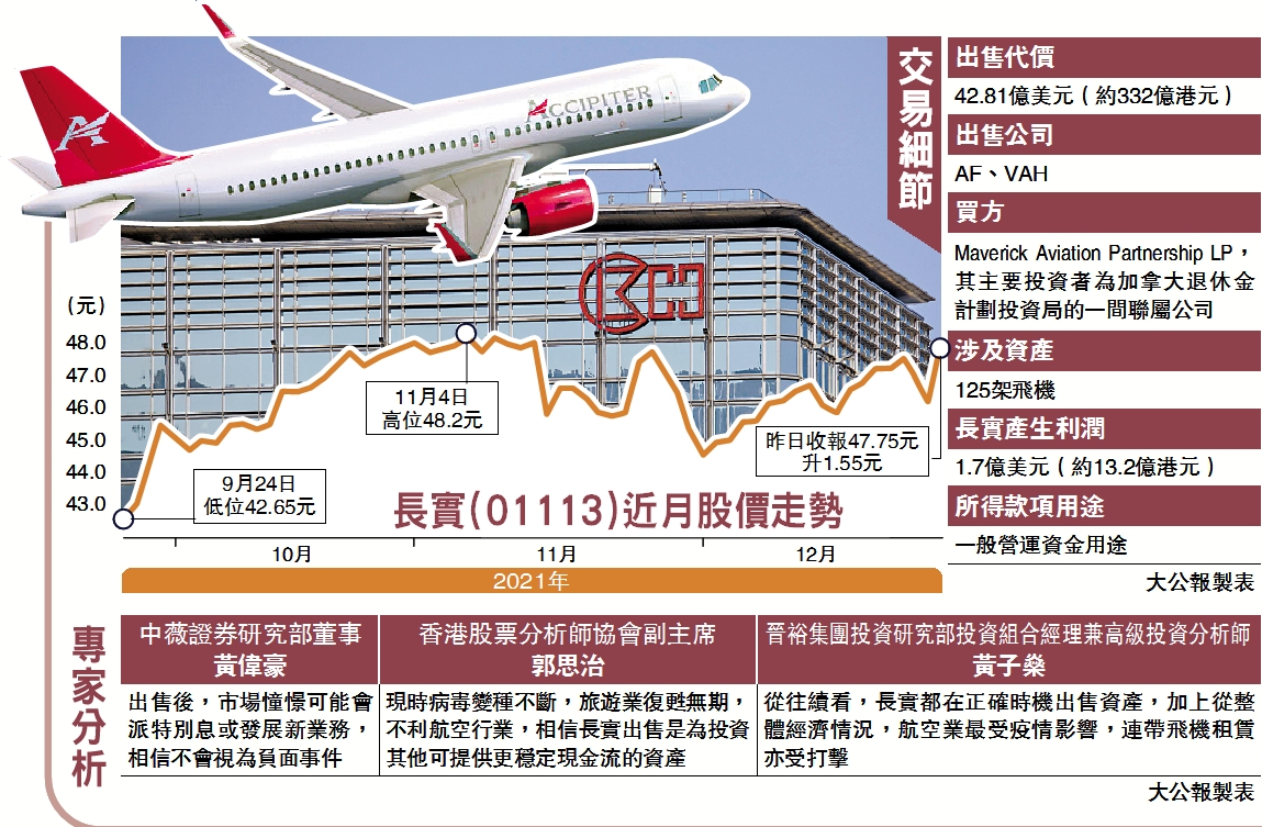 根據買賣協議,長實集團將旗下兩間飛機租賃公司AF及VAH出售,分別代價為24.41億元及18.4億元,而兩間公司共擁有125架飛機。買方為一間投資航空業相關的投資平台Maverick Aviation Partnership LP,其主要投資者為加拿大退休金計劃投資局的一間聯屬公司。