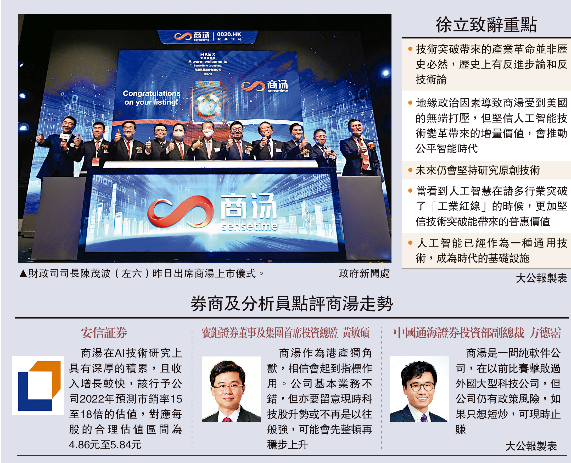商湯(00020)首日掛牌表現超預期,一度升23%,收市漲7%,散戶每手賬面賺280元。聯合創始人兼主席徐立在上市儀式致辭時表示,商湯受到美國的無端打壓,但堅信人工智能(AI)技術變革帶來的增量價值,會推動公平智能時代。他強調,商湯的人工智慧技術聚焦在虛擬和現實世界的邊界上,而公司亦做了很多行業第一。大行報告則指出,商湯作為人工智能獨角獸,在AI技術研究上具有深厚的積累,予公司每股合理估值介乎4.86元至5.84元。\大公報記者 柴 進