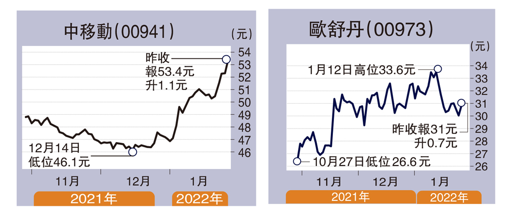 中移動昨日高見53.8元,大升接近3%;收市報53.4元,仍升1.1元,升幅達2.1%,明顯升穿去年8月時的高位52.95元。