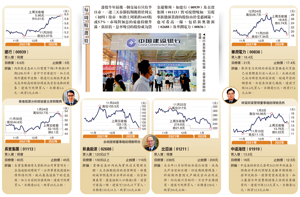 港股牛年最後一個交易日只有半日市,一連三天春節假期後將於周五(初四)復市。恒指上周累跌1415點或5.7%,市場對加息的憂慮持續升溫,低估值,息率吸引的股份成為資金避難所,如建行(00939)及長實集團(01113)皆可現價吸納。另從事新能源業務的股份由於受惠國策,也可看高一線,包括新奧能源(02688)及華潤電力(00836)。