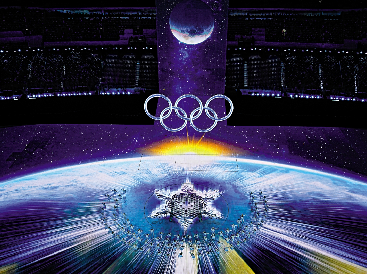張藝謀對該環節的創意設計這樣評價:「有科技含量、有文化韻味、又有炫酷的現代感。數字光影的『冰雪五環』與『巨型雪花』交相輝映,這是人類文明與奧運精神的交流與對話。」