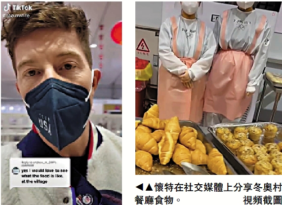 此次是美國單板滑雪傳奇運動員肖恩·懷特第五次冬奧之旅。他在社交媒體上分享了冬奧村的餐廳,大讚食物「十分美味」。視頻顯示,餐廳內可以看到多個食品餐台,提供中式餐點、亞洲菜、意大利麵、各種水果和芝士等世界美食。懷特稱:「我很好奇吃什麼,結果發現這裏真的什麼都有,食物非常美味。」他還展示了取餐時要戴上一次性手套來保證安全。