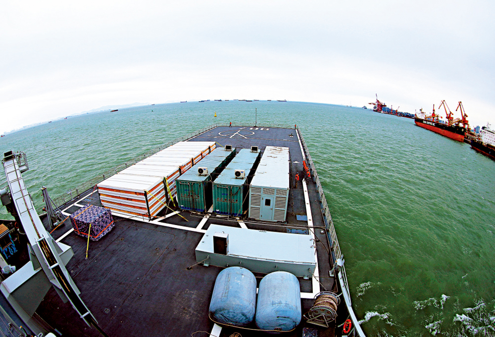 查干湖艦共有7個補給門架,右舷3個,左舷4個,包括液貨補給門架、乾貨補給門架,以及專用於航母的航空燃油補給門架,艦艉設置了縱向補給系統。艦艉還有雙機庫,可容納兩架直-8運輸直升機,實施垂直補給。查干湖艦在4個小時之內就可為航母補齊物資,而補給其他艦艇的時間則更短。