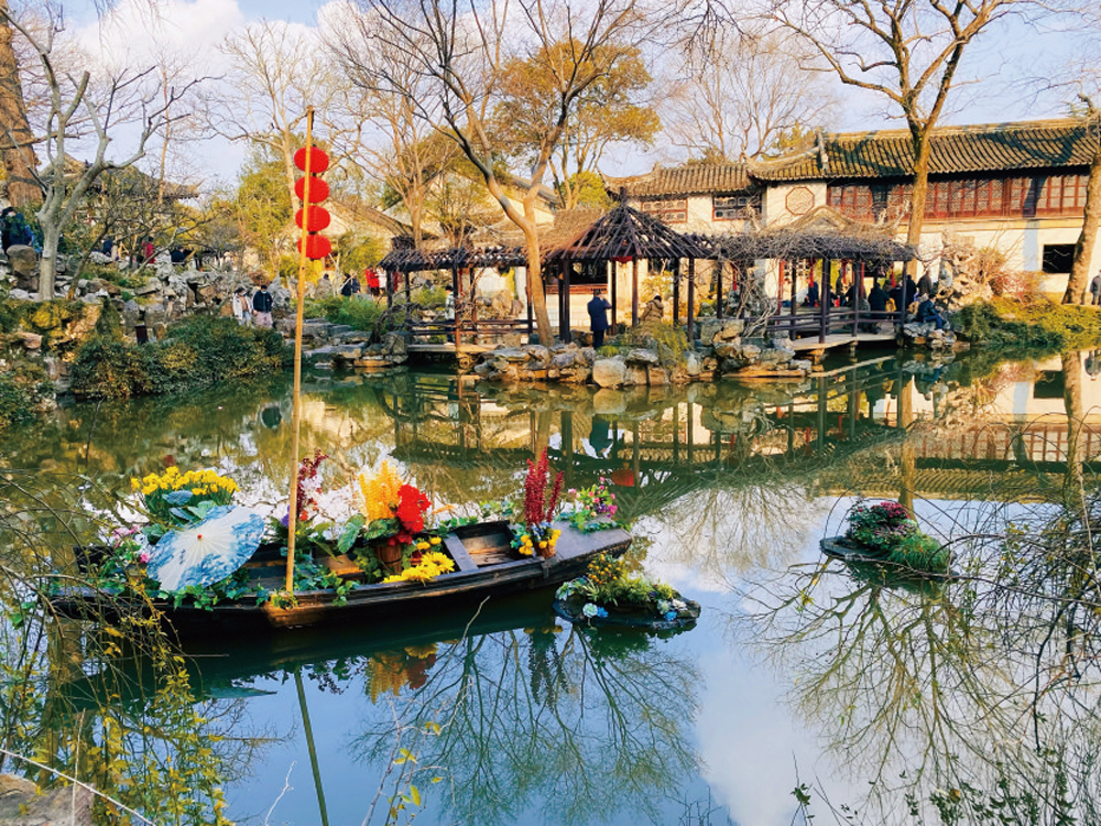 留園中變化多樣的建築群,縱橫不規則的交錯、延伸、穿透,將奇石與亭榭、小橋與水池,植物與庭院巧妙分割。紅色錦鯉結伴游弋在翠竹與黃梅的倒影中,就好像在園中沒有寒冬,枝頭花苞春意盎然。園內遊人如織,在美景中大方的與好友親朋綻放笑容的合影,一副國泰民安的春節喜慶的氛圍亦是春意盎然。