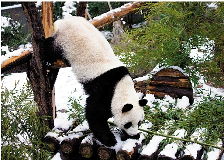 昨日一場降雪過後,南京紅山森林動物園的大熊貓在雪地裏玩耍,享受降雪帶來的樂趣。 新華社