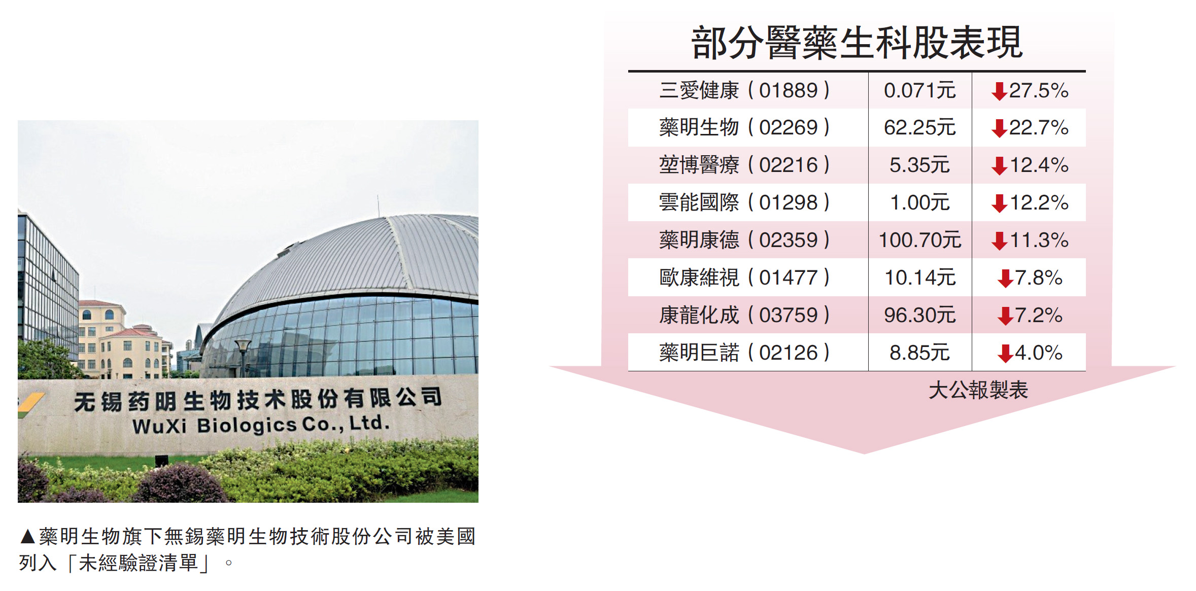 【大公報訊】美國政府繼續以「莫須有」罪名打壓中資企業,把藥明生物(02269)等33家中資企業列入「未經驗證清單」,引發投資者恐慌拋售股份離場。藥明生物股價一度急瀉31%,股份在交易中段時間申請停牌,停牌前報62.25元,跌22.7%;同系藥明康德(02359)全日最多跌27%,但澄清未被列入有關清單,跌幅在收市時收窄至11.3%,報100.7元;另一同系藥明巨諾(02126)曾跌8%,收市時報8.85元,跌4%。