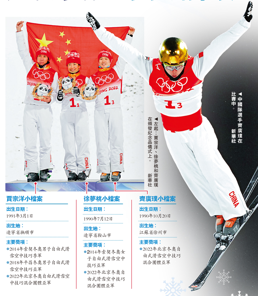 北京冬奧會自由式滑雪項目昨晚在張家口賽區雲頂滑雪公園上演空中技巧混合團體賽決賽,中國隊雖然在首輪表現出色,以首名晉級次輪,但賈宗洋在次輪中出現失誤,最終中國以324.22分獲得銀牌,美國以338.34分奪金,銅牌是加拿大,瑞士則得殿軍。\大公報記者 張銳