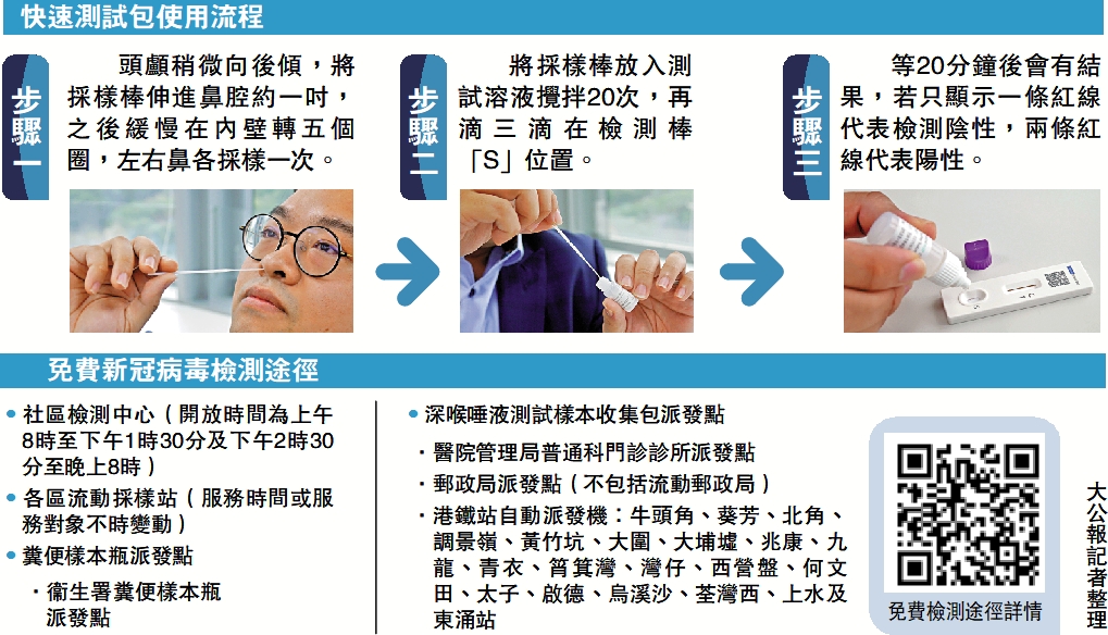 【大公報訊】快速抗原測試(RAT)是篩查新冠病毒方法之一,測試結果一般20分鐘可讀取。不過,快速測試只能作自願檢測,不能代替強制檢測。醫院管理局呼籲,快速抗原測試結果呈陽性市民,應盡量尋求親友協助或利用速遞服務,提交深喉唾液樣本進行「覆檢」,並耐心在家等候結果,不應前往急症室。