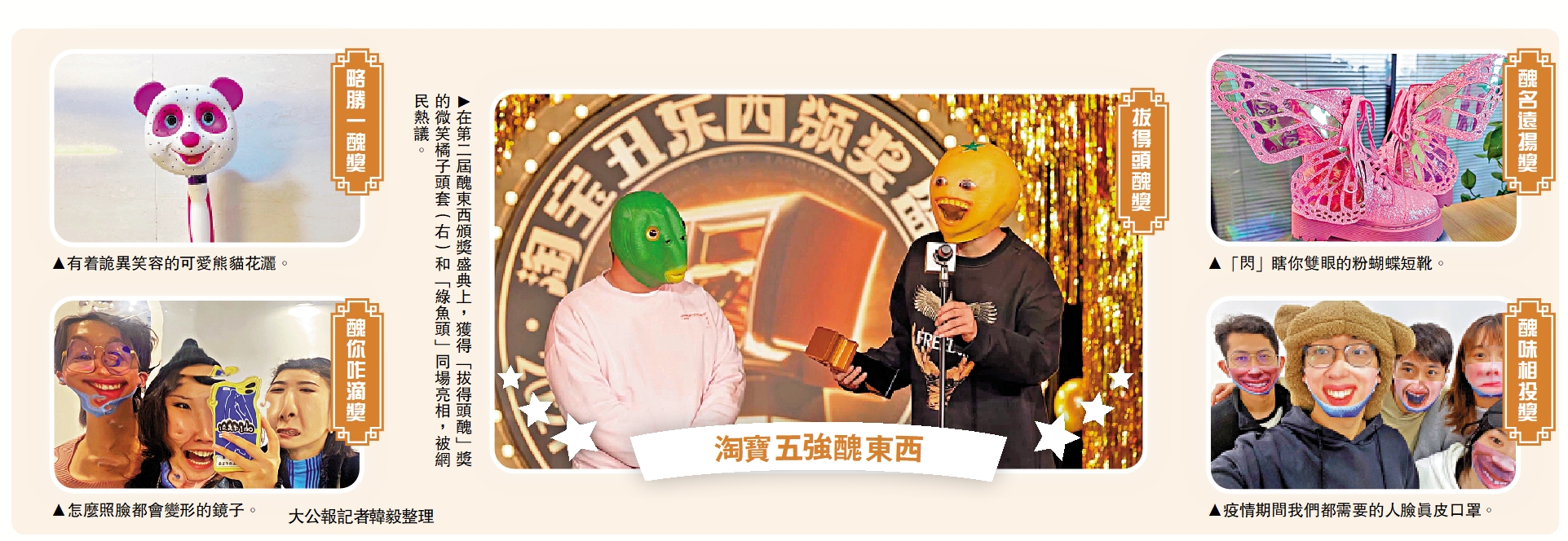 不久前網絡上舉辦的第二屆醜東西頒獎盛典上,5個淘寶平台上銷售的醜商品,在經過激烈投票後,從40個網民提名的醜商品中脫穎而出。創意巨臂招財貓和呆滯綠頭魚面具等商品雖未入圍五強,亦收穫網民喜愛。眼球經濟下,具有創造力、誇張的設計迅速在互聯網吸引關注。討論「醜」、購買「醜」,追捧「醜」已成為年輕人的又一愛好。不少消費者表示,看過頒獎典禮後,立馬打開購物軟件搜索購買。/大公報記者 韓毅