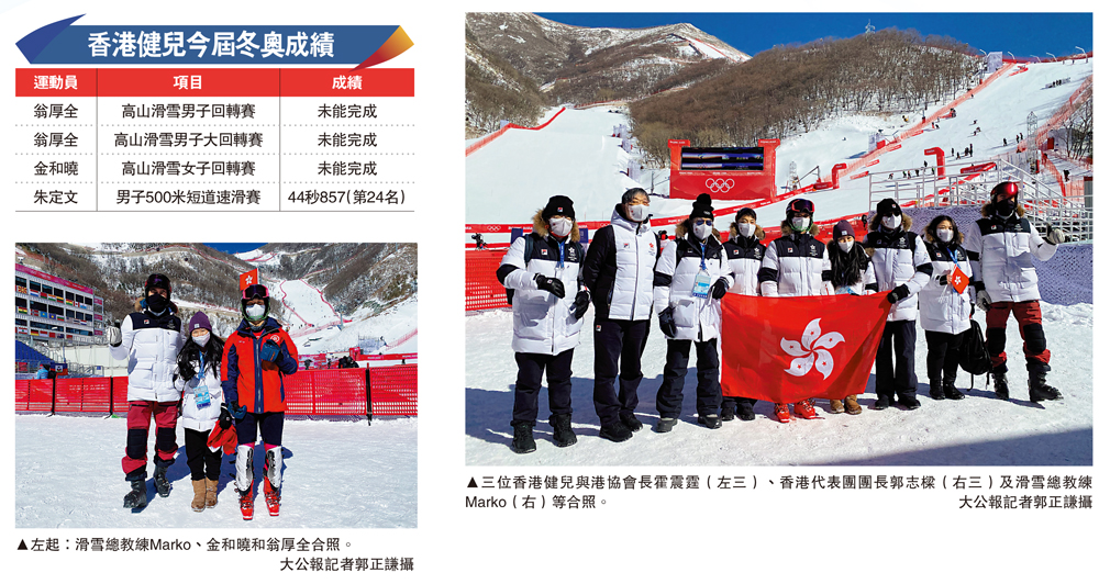 在香港滑雪運動員翁厚全昨天出戰高山滑雪男子回轉賽後,3名中國香港代表團的選手都已參加所有賽事,代表團亦正式結束今次北京冬季奧運之旅。雖然3人都未能在各自參加的項目晉級,但代表團團長郭志樑在總結港隊本屆表現時表示,3人出戰冬奧已是香港一大突破,各人經今次參賽都會有所成長,他又談到政府將會在白石體育園興建符合國際賽事要求的溜冰場,他預計可以令滑冰項目,包括短道速滑在香港更有效地發展。