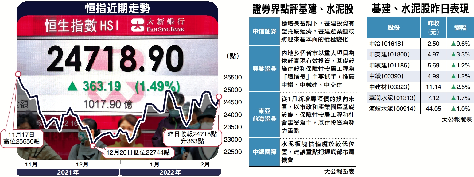 烏克蘭局勢緩和,亞太區股市應聲反彈;市場氣氛轉好,港股終止過去3日跌勢,恒指昨日飆高363點,收報24718點。內地1月份CPI漲幅不及預期,投資者憧憬內地有空間加碼寬鬆,基建投資作為「穩增長」重要工具,基建股有買盤承接,中國中冶(01618)股價升近一成,中交建(01800)股價升3%。中信証券相信,穩增長基調下,基建投資有望托底經濟,基建產業鏈或將迎來基本面積極變化。\大公報記者 劉鑛豪