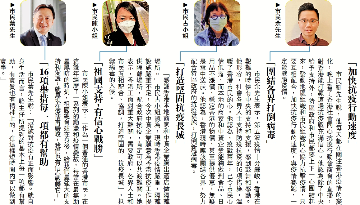 市民陳小姐表示:「作為一個普通的香港市民,在這幾年經歷了一系列的動盪和疫情變故,每當在最無助最黑暗的時刻,祖國總會站在身後,給我們最強大的支持和愛護,就算現在疫情再嚴峻,我們也有信心戰勝它!」