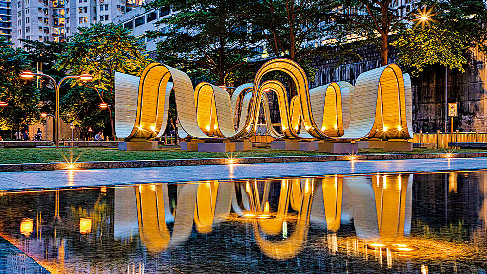 很多城市商業辦公區面臨的一大困境是工作日熱鬧、周末冷清,而太古坊商區卻像一個成功的「多面手」,不同時段風采各不同。一到周末,公園、綠地和廣場通通成為親子遊樂場,尤其是港島東中心門前的景觀。開闊的草地上總是「未見其人、先聞其聲」,孩子們格格的嬉笑叫喊聲此起彼伏,時不時一輛滑板車在眼前呼嘯而過,一溜煙又蹤跡全無。整齊的石櫈是家長或老人們的最愛,和煦的陽光早已將其加熱到合適的溫度,不冷不熱、恰到好處。藝術家Paul Cocksedge的波浪形的大型藝術裝置更是人氣十足,人們盡情發揮創意,波峰下可以煲電話粥,波浪裏可以躺着看漫畫書,波谷上可以窩着一家人盡享天倫。