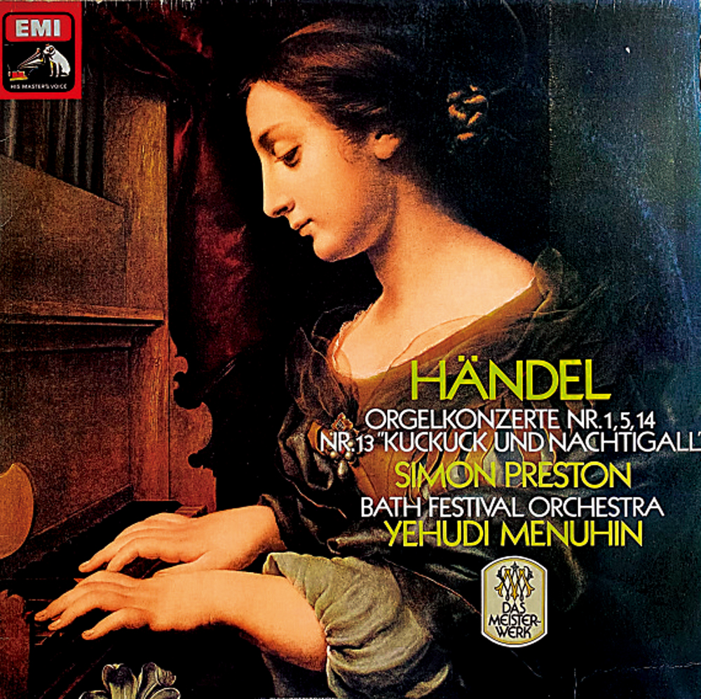 今天是偉大的巴洛克時期英籍德國作曲家喬治·弗雷德里希·亨德爾誕辰三百三十七周年,本周推薦唱片中的曲目自然由大師譜寫。德國EMI唱片公司於一九六八年發行了由二十世紀美國著名小提琴大師、指揮家耶胡迪·梅紐因執棒巴斯節日管弦樂團,攜手英國管風琴演奏家西蒙·普萊斯頓演繹的亨德爾管風琴協奏曲選集。本張包含四首曲子的專輯收錄了第一號、第五號、第十四號和第十三號《布穀鳥與夜鶯》管風琴協奏曲。唱片封面也切題地選擇了由十七世紀佛羅倫斯畫家卡洛·多奇繪製的《管風琴前的聖塞茜莉亞》。