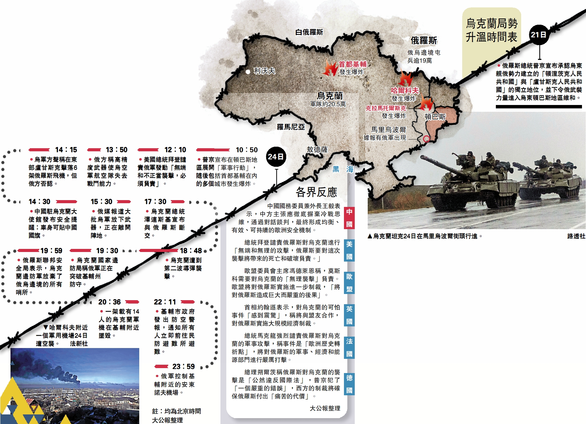 總統馬克龍強烈譴責俄羅斯對烏克蘭的軍事攻擊,稱事件是「歐洲歷史轉折點」,將對俄羅斯的軍事、經濟和能源部門進行嚴厲打擊。