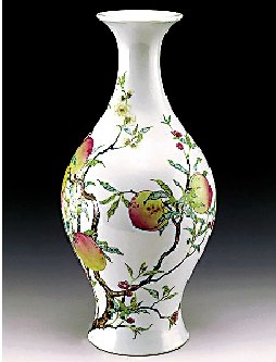 粉彩是從五彩發展而來的,始創於清代康熙晚期,雍正、乾隆二朝達至鼎盛。由於所用彩料多為西方傳入,故又稱作「洋彩」。雍正皇帝尤愛粉彩,當時匠人對粉彩瓷的造型、線條、色彩等工藝極其講究,從而造就了「雍正粉彩」的輝煌。因此,這隻蝠桃紋瓶可謂代表着整個清代的粉彩製作水平。