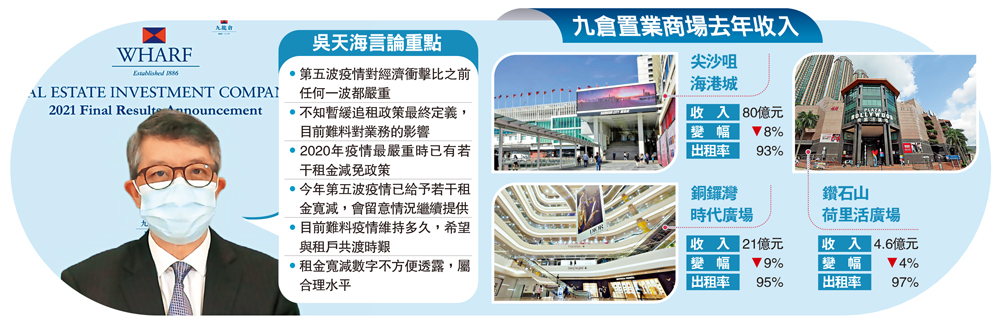 新一份財政預算案公布,立法限制業主向指定行業租戶暫緩追討欠租三個月,九倉置業(01997)主席兼常務董事吳天海稱,不知最終政策如何落實,例如「中小企業」的定義,因此目前難以預料最終對公司的影響。他又強調,集團自2020年開始已提供租金寬減,且幅度屬合理水平,今年第五波疫情爆發後再次給予若干租金寬減,會與租戶共渡時艱。\大公報記者 趙建強