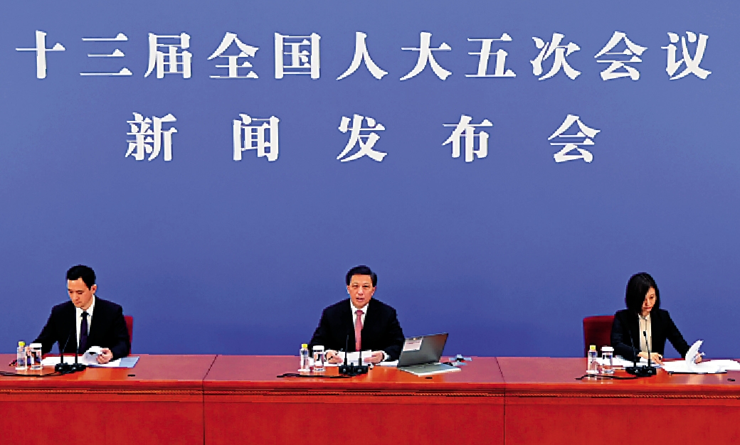 十三屆全國人大五次會議3月5日在人民大會堂開幕。十三屆全國人大五次會議4日舉行新聞發布會,大會發言人張業遂就會議議程和人大有關工作回答了中外記者提問。張業遂介紹,本次大會5日上午開幕,11日上午閉幕,會期6天半。在介紹去年立法工作時,張業遂表示,在加強憲法實施和監督方面,主要是全面修改香港基本法附件一和附件二,形成一套符合香港法律地位和實際情況的民主選舉制度,維護憲法和香港基本法確定的香港特別行政區憲制秩序,確保「一國兩制」行穩致遠。\大公報記者 張寶峰北京報道