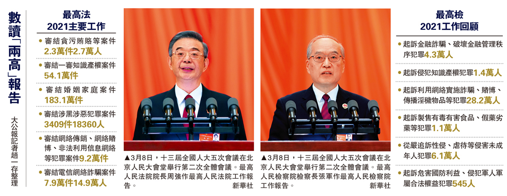 十三屆全國人大五次會議8日上午舉行第二次全體會議,最高人民法院院長周強和最高人民檢察院檢察長張軍分別向大會作工作報告,兩份報告均重點提及將從嚴懲治拐賣婦女兒童犯罪行為。最高法報告指,嚴懲性侵、拐賣婦女兒童和收買被拐賣婦女兒童等犯罪,強化對被拐賣婦女兒童的司法保障。對殘害婦女兒童等犯罪當判死刑的判死刑。最高檢報告亦指出,今年將繼續從嚴追訴拐賣人口犯罪,對收買、不解救、阻礙解救被拐賣婦女兒童犯罪堅決依法追訴、從嚴懲治。\大公報記者 趙一存北京報道