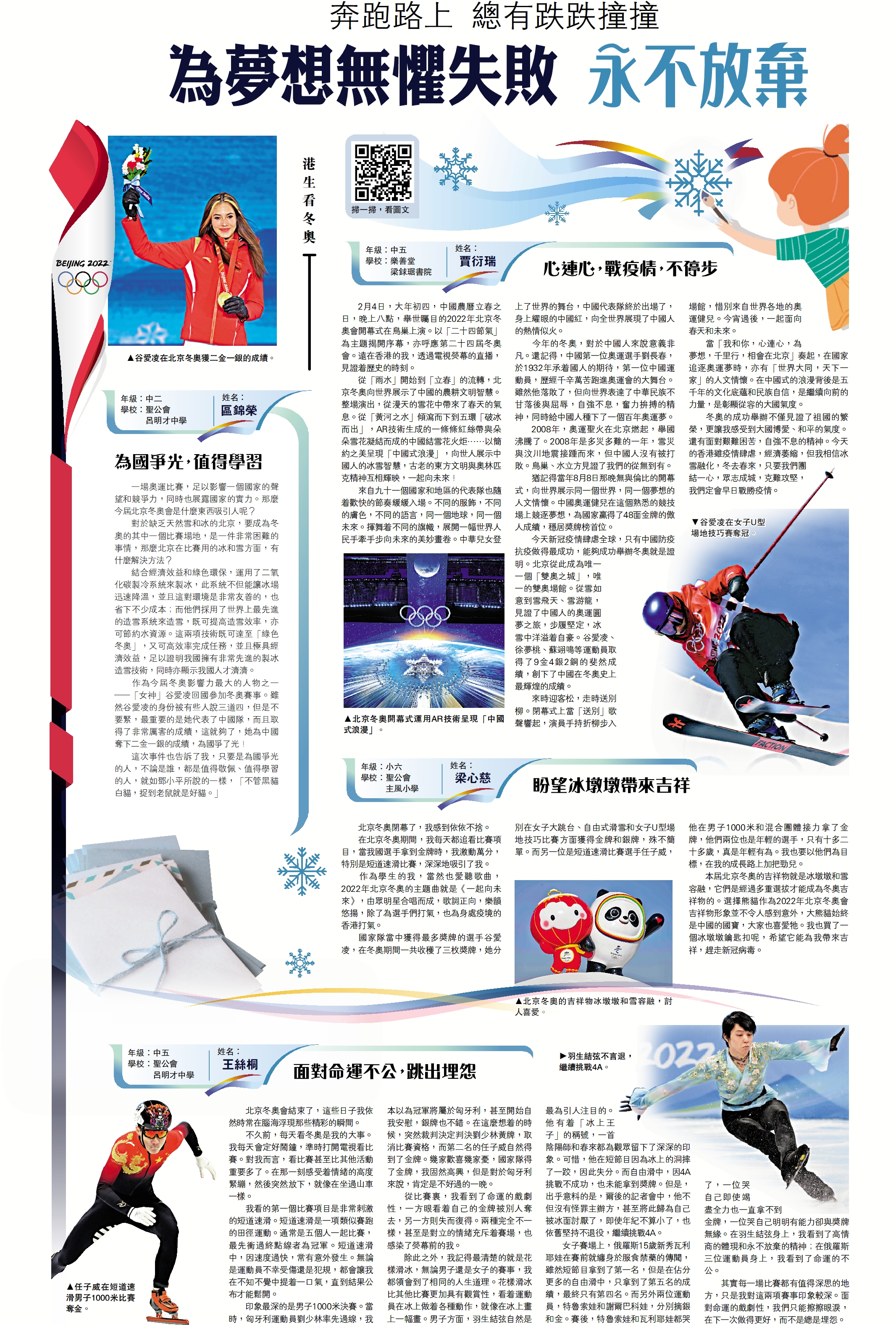 冬奧的成功舉辦不僅見證了祖國的繁榮,更讓我感受到大國博愛、和平的氣度。還有面對艱難困苦,自強不息的精神。今天的香港雖疫情肆虐,經濟萎縮,但我相信冰雪融化,冬去春來,只要我們團結一心,眾志成城,克難攻堅,我們定會早日戰勝疫情。