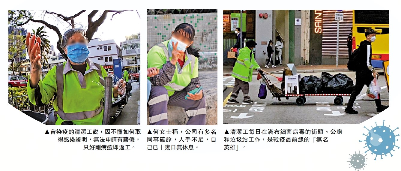 在牛頭角定安街工作多年的清潔工何女士稱,公司有手套提供,每月一盒口罩,防護物資算充足。最慘是人手不足,公司已有廿多名同事確診無法返工,日日都不夠人手,「我都有十幾日無休過息,現在好多位置都無人清潔,日日都好多垃圾,口罩更是經常吹到成街都係,要不停地去掃。」