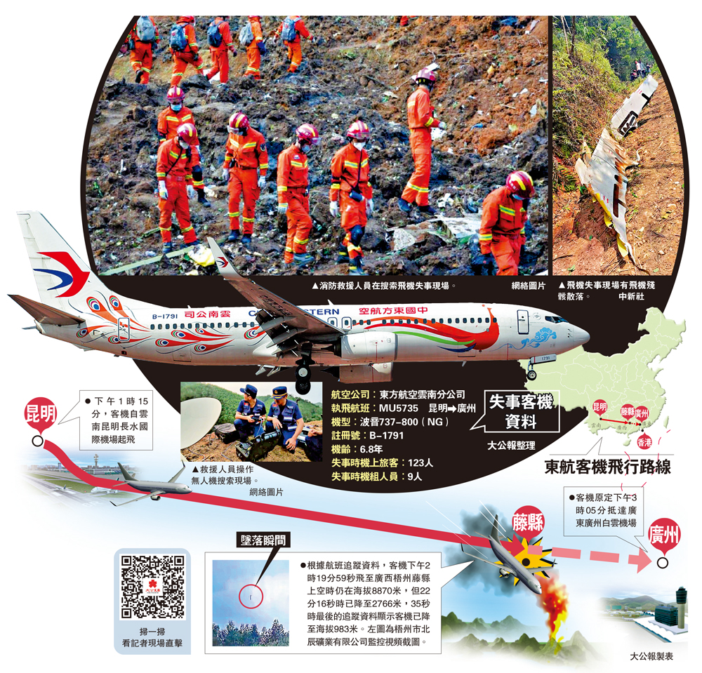 21日14時38分許,東航一架搭載132人的波音737客機在廣西梧州藤縣上空失聯並墜毀。機上人員共132人,其中旅客123人、機組9人。事故發生後,中共中央總書記、國家主席、中央軍委主席習近平立即作出重要指示,要求立即啟動應急機制,全力組織搜救,妥善處置善後。目前,事故現場已展開緊急救援,最先抵達的救援部隊發現客機殘骸和碎片,具體傷亡情況尚未明確。目前,東航官網頁面已轉為黑白色,而截至晚上十點,現場沒有具生命跡象的傷員抬出。\綜合新華社 記者曾萍、蘇徵兵廣西報道