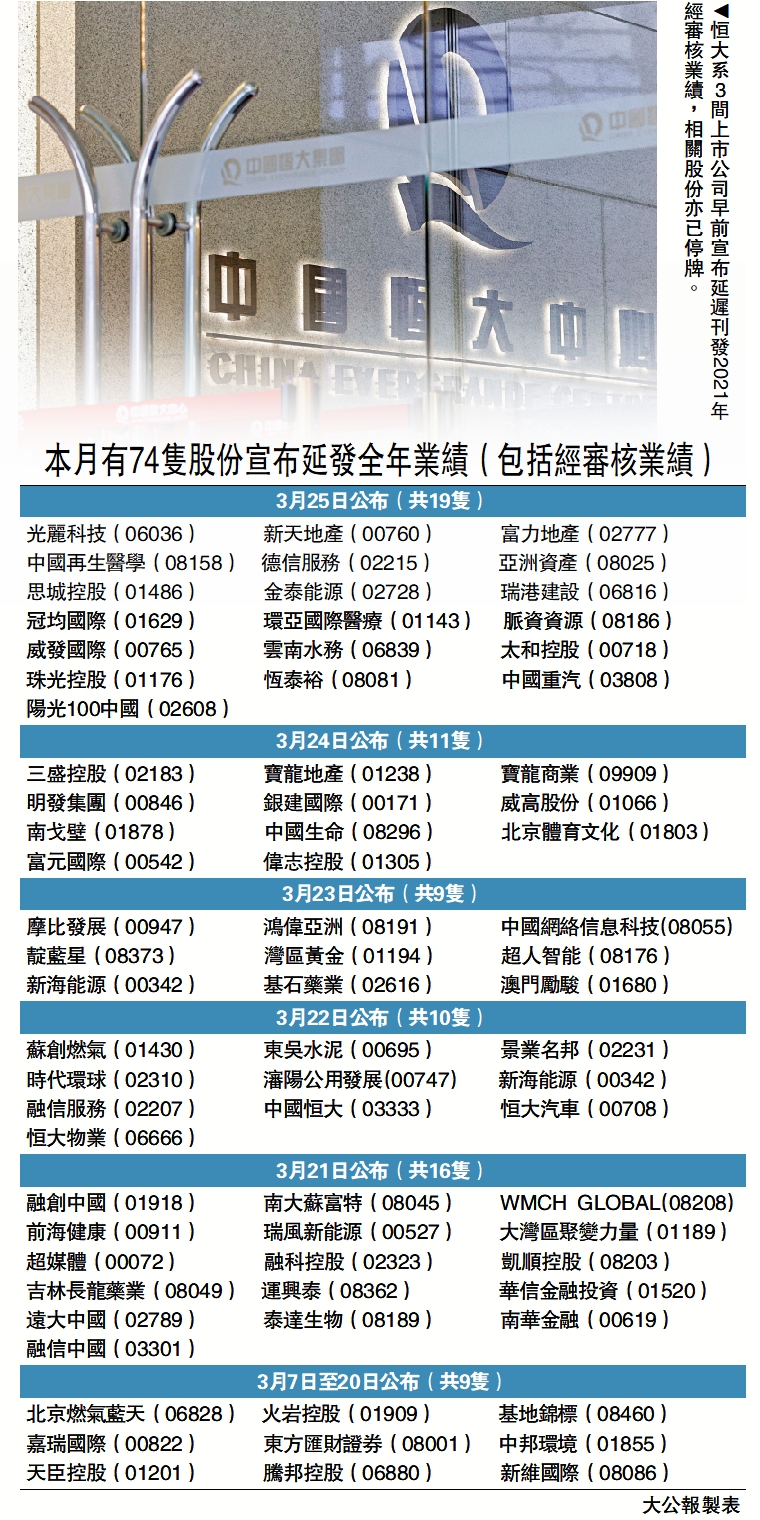 事實上,3月份已有多家內房股宣布延發業績,包括恒大系3家在港上市公司中國恒大(03333)、恒大物業(06666)、恒大汽車(00708)、富力地產(02777)、奧園(03883)等。永裕證券董事總經理謝明光指,自去年下半年起,內房股的經營情況發生重大變化,核數師自然增加了大量額外的審計工作,而且不少內房股涉及債務重組,投資者需等待業績公布後,才能對企業的營運情況有所了解。