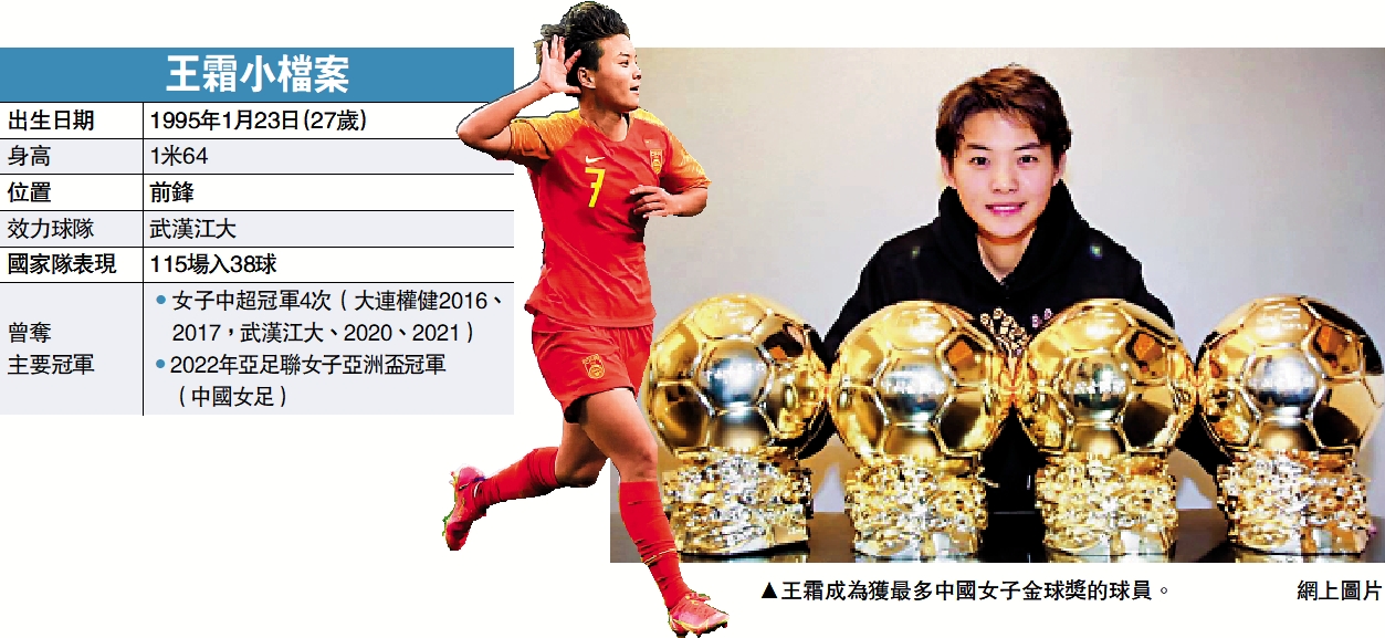 憑藉在去年東京奧運會預選賽、全運會和女超聯賽的優異發揮,王霜第四次榮膺中國女子金球獎,成為了中國金球獎歷史上獲得獎項最多的球員。在10人特別評委組的投票中,王霜拿到52分榮膺首位,目前正在歐洲留洋的唐佳麗和沈夢雨排名二、三位。