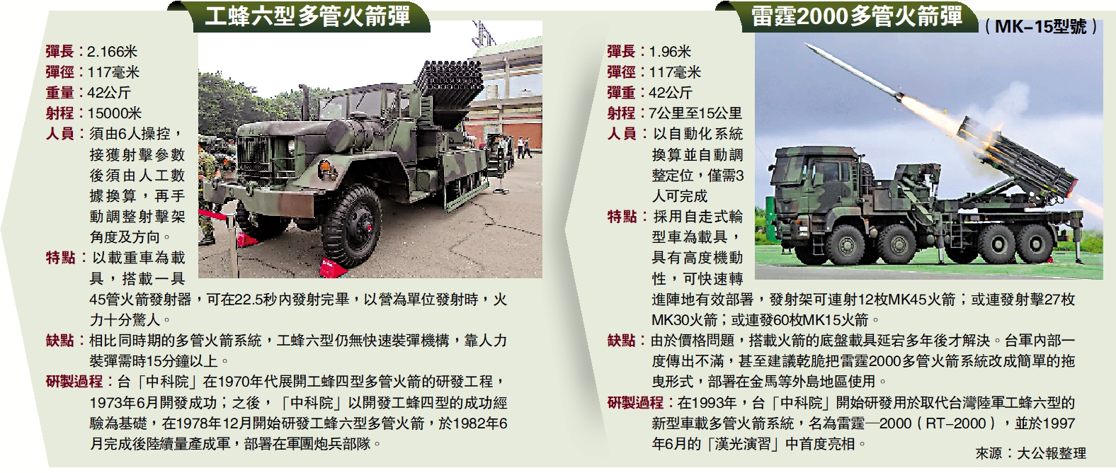 台陸軍報告表示,陸軍自2014年至今,委由「中科院」執行工六火箭彈研改,用於射訓成效良好。陸軍庫存逾期的工六火箭彈有5088枚。