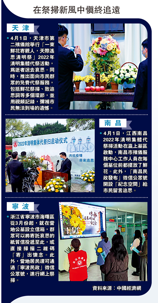 •4月1日,天津市第二殯儀館舉行「一束鮮花寄親人,天際遙思清明祭」2022年清明集體代祭活動,為逝者送去哀思。同時,推出面向市民群眾的免費代祭服務,包括鮮花祭掃、致追思詞等多個環節,並用視頻記錄,彌補市民無法到場的遺憾。