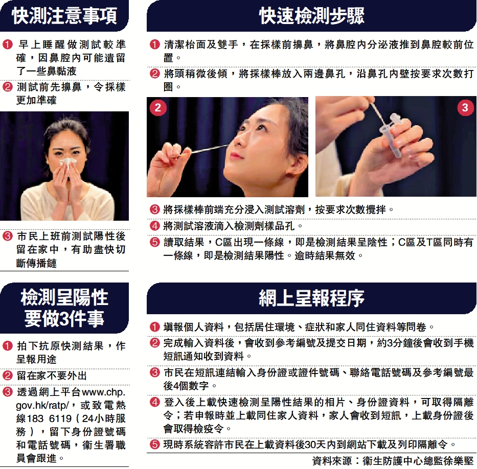 衞生防護中心總監徐樂堅昨日提醒市民,最好早上採樣,並在採樣前擤鼻,將鼻腔內分泌液推到鼻腔較前位置,檢測結果會較準確。第五波疫情下的110萬名新冠康復者,不需快速測試,但如出現症狀,仍可進行測試,保障自己。
