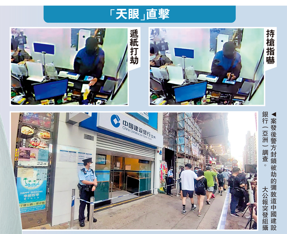 疫下經濟不景,失業率高企下,有人鋌而走險打劫銀行。昨日一名蒙面男子闖入油麻地彌敦道中國建設銀行(亞洲),向櫃位女職員遞上一張寫有「打劫,我有槍,畀晒啲錢我」的字條,然後亮出一把疑似手槍的物體指嚇職員,搶走約一萬四千元現金後奪門而出,登上一輛巴士後逃去無蹤。大批穿上避彈衣的警員事後大規模搜捕劫匪。
