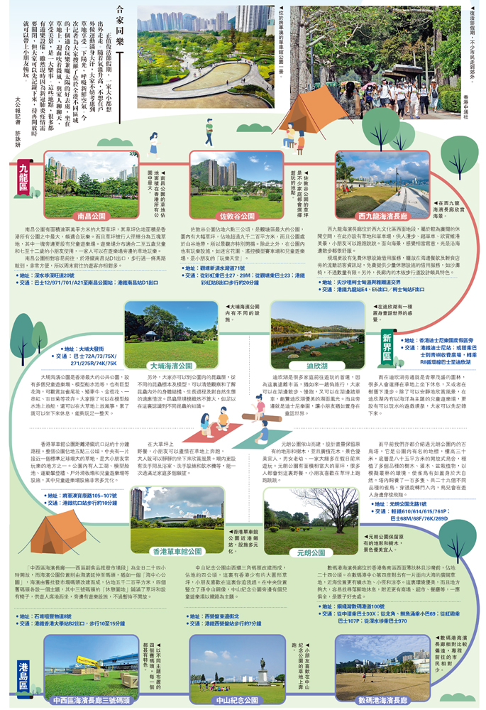 正值復活節假期,一家大小都想出外走走。隨着氣溫升高,不想在戶外做運動滿身大汗,大家不妨考慮到草地享受一下陽光,呼吸新鮮空氣。今次記者為大家搜羅了位於全港不同區域的十個適合玩樂兼曬太陽的好去處,坐在草地上,迎面吹着微風,與家人聊聊天,享受美景,是一大樂事。這些地點,很多都有遊樂設備,雖然現時因為新冠肺炎疫情需要關閉,但大家可以先記錄下來,待再開放時就可以帶上小朋友暢玩。\大公報記者 許詠妍