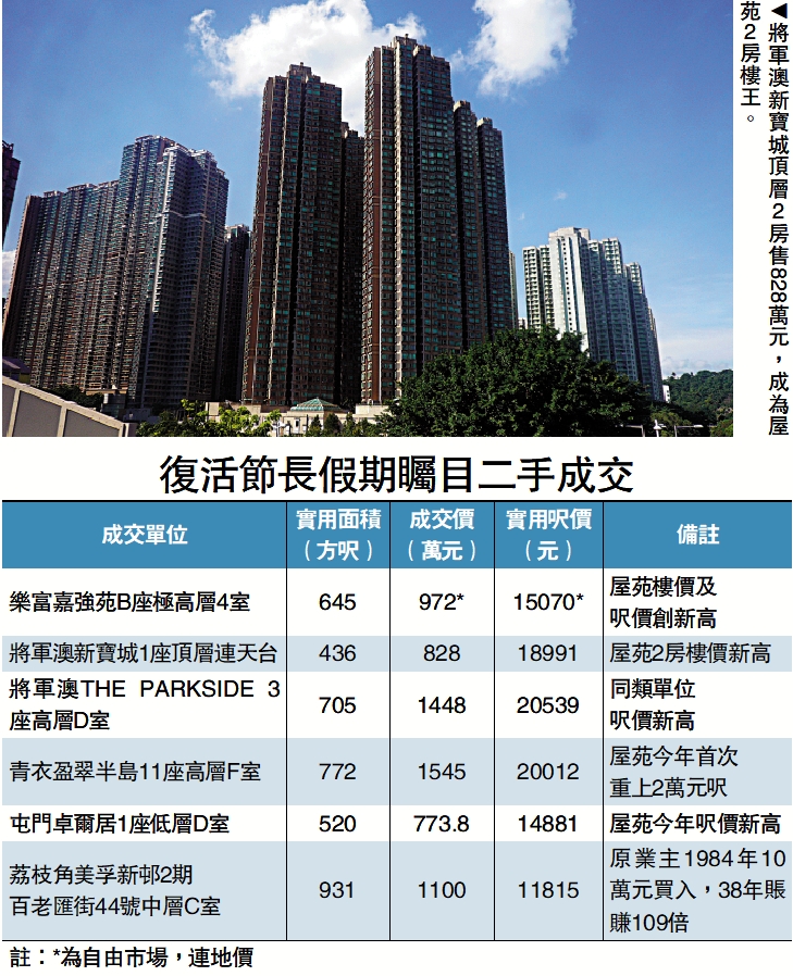 樓價指數反彈,買家趁長假期趕入市,各區二手價量俱升。其中,將軍澳於同區住宅項目高補地價效應下,4月至今成交量急飆1.4倍,區內上車屋苑新寶城2房更衝上828萬元,破盡同類紀錄。傳統十大屋苑同樣熱鬧,過去周末交投量升35%,創11個月新高。\大公報記者 林惠芳